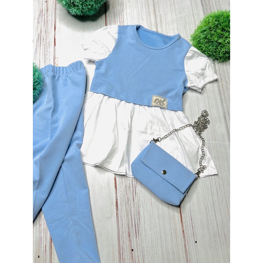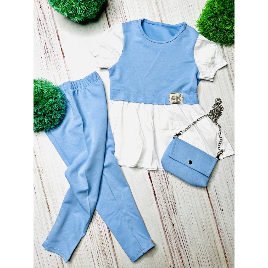 Štýlový a elegantný dievčenský modro-biely setík, ktorý tvorí predĺžený krátkorukávový top, pohodlné nohavice a roztomilá kabelka v rovnakom dizajne. Predĺžený vrch má moderný dievčenský strih, krásne padá a pôsobí ako módny kúsok vhodný aj na slávnostnejšie príležitosti.