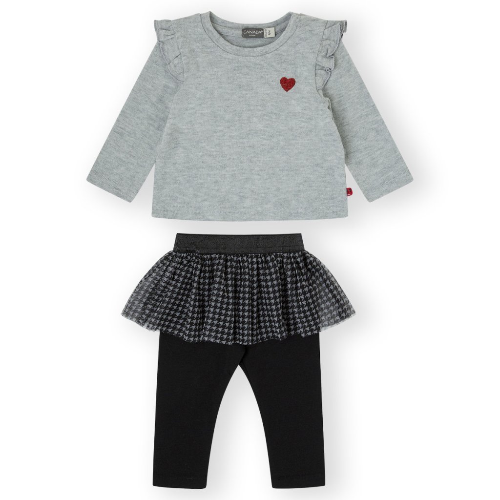 Moderný dievčenský sivočierny set, ktorý pozostáva z mäkkého pulóvrika a štýlových sukňolegín. Pulóvrik je príjemný na dotyk, vhodný na celodenné nosenie a má pohodlný strih, ktorý neobmedzuje v pohybe.