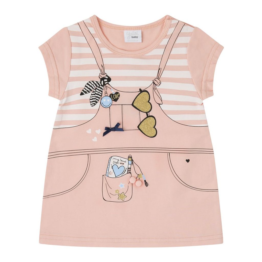 Pohodlné a štýlové bavlnené dievčenské šaty tunika v jemnej ružovej farbe sú ideálne na každodenné nosenie. Šaty majú praktický krátky rukáv a jemnú, decentnú potlač, ktorá dodáva outfitu hravosť a dievčenský šarm. Mäkký bavlnený materiál je príjemný na dotyk, šetrný k detskej pokožke a umožňuje voľný pohyb počas hry či školy. Univerzálny strih tuniky sa ľahko kombinuje s legínami alebo pančuchami.