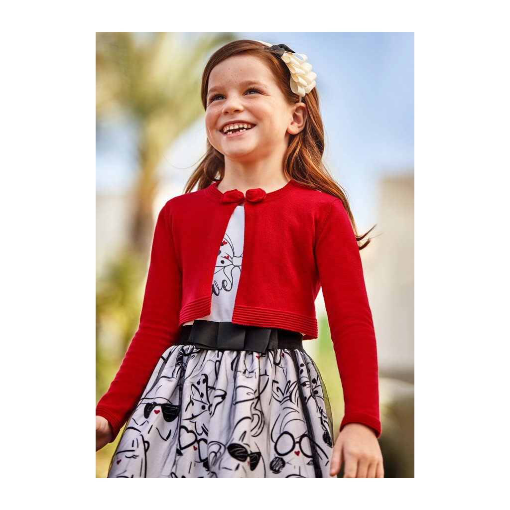 Elegantné a pohodlné bolerko v žiarivej červenej farbe, ideálne na doplnenie šiat či sviatočných outfitov. Jemný materiál a krátky strih dodávajú dievčenský a slávnostný vzhľad.