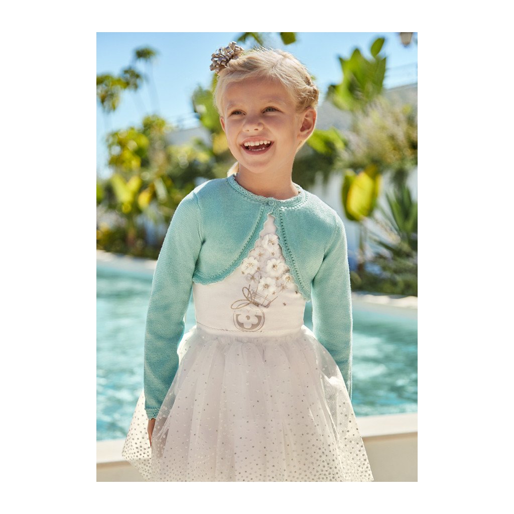 Roztomilé bolerko v jasnej tyrkysovej farbe, ktoré perfektne doplní každé šaty alebo sviatočný outfit. Mäkký materiál a pohodlný strih zaručujú štýlový a dievčenský vzhľad.