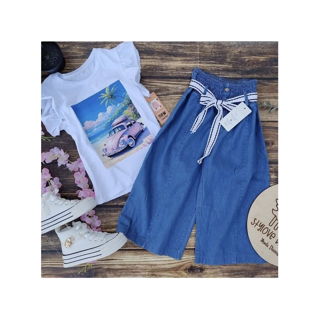 Štýlové dievčenské rifľové nohavice v 7/8 dĺžke s rozšíreným strihom a opaskom, ktorý zvýrazní pás a dodá outfitu elegantný vzhľad. Ľahký rifľový materiál je pohodlný a zároveň odolný, ideálny na každodenné nosenie a voľný pohyb.