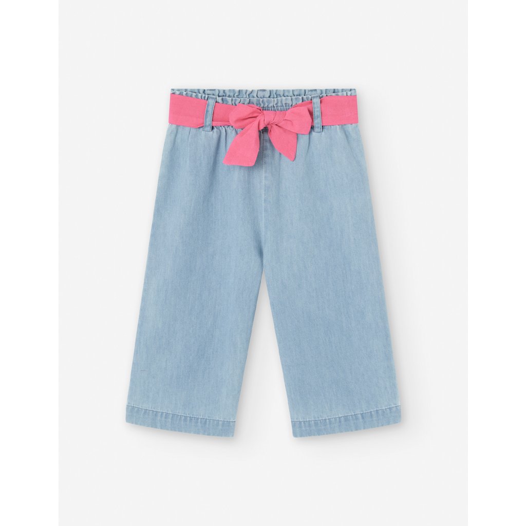 Štýlové dievčenské rifľové nohavice v 7/8 dĺžke s rozšíreným strihom a s ružovým  opaskom z jemého materiálu, ktorý zvýrazní pás a dodá outfitu elegantný vzhľad. Ľahký rifľový materiál je pohodlný a zároveň odolný, ideálny na každodenné nosenie a voľný pohyb.