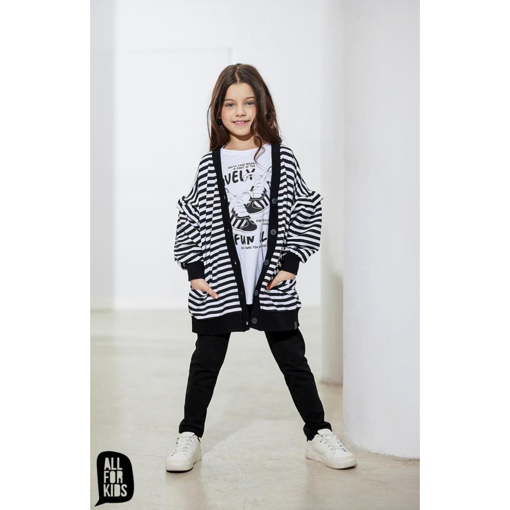 Pohodlný a štýlový sveter s predĺženým strihom, zdobený modernými prúžkami. Mäkký materiál poskytuje príjemné nosenie a dodáva outfitu hravý dievčenský vzhľad.