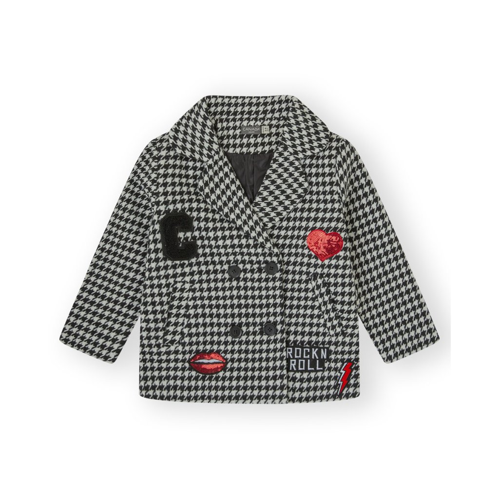 Nadčasový bielo-čierny károvaný vzor dopĺňajú moderné nášivky, ktoré dodávajú kabátu originálny a módny charakter. Kabát sa ľahko kombinuje s nohavicami, sukňami aj šatami a je vhodný na každodenné nosenie aj špeciálne príležitosti.
