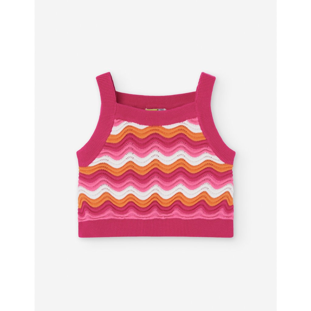 Štýlový a pohodlný pletený top so žiarivými prúžkami, ideálny na teplejšie dni. Jemná pletenina a veselý dizajn dodávajú outfitu hravý dievčenský vzhľad.