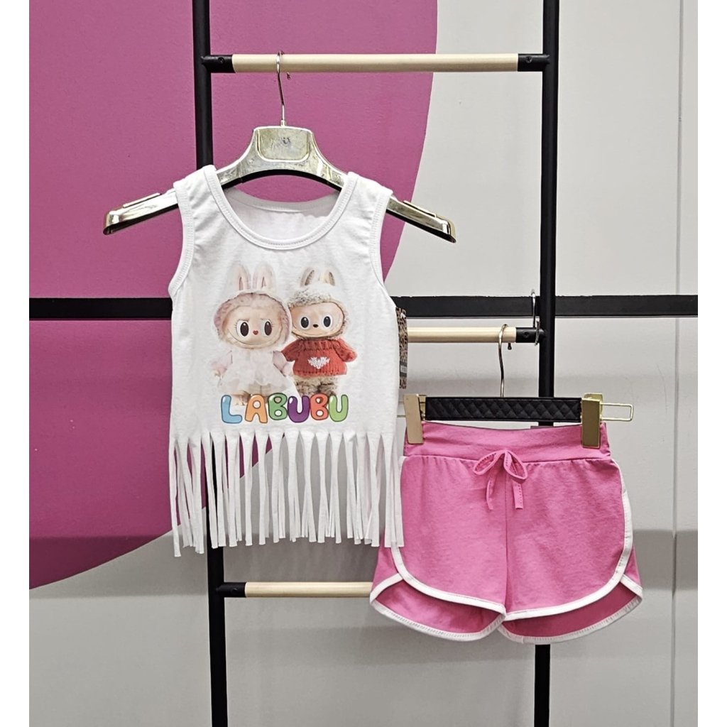 Štýlový a pohodlný letný set pre malé slečny, ktorý spája hravosť s komfortom. Tento dvojdielny set obsahuje strapcový top s potlačou labubu a pohodlné cyklámenove šortky, ideálne na horúce letné dni a voľnočasové aktivity.