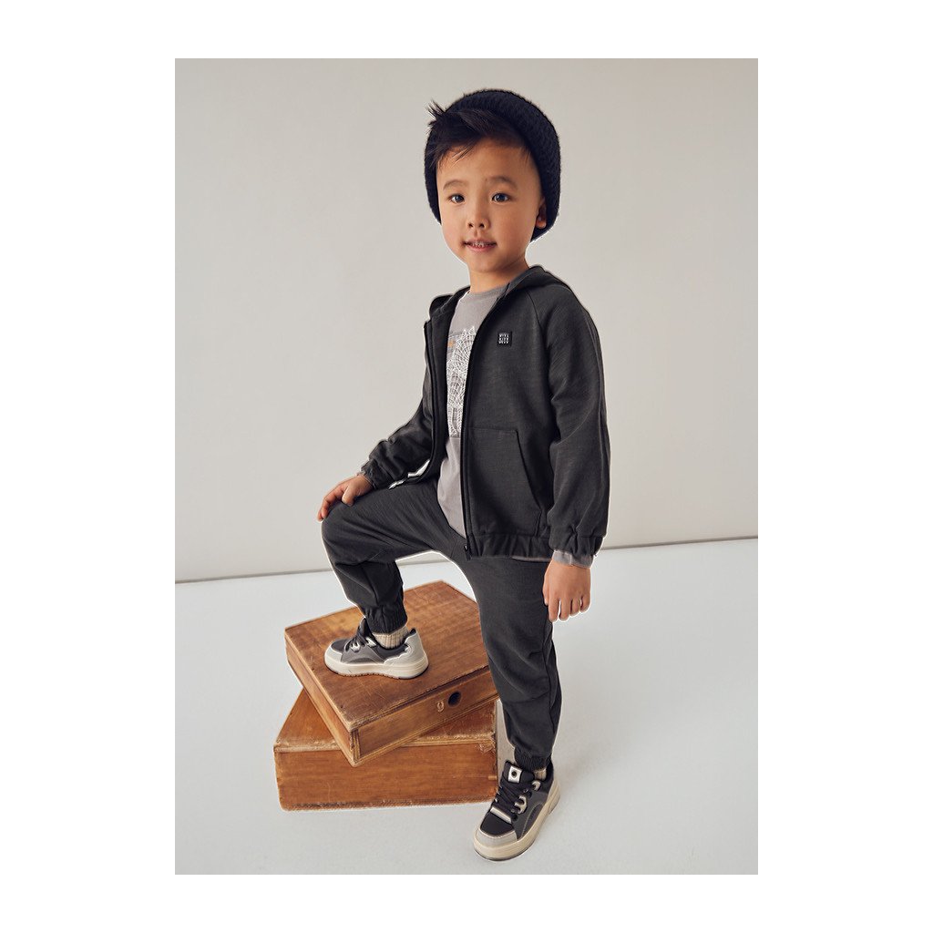 Štýlová a pohodlná dvojdielna tepláková súprava Mayoral je ideálna na každý deň aj voľný čas. Súprava obsahuje tepláky a mikinu na zips s kapucňou a vreckami, ktorá zabezpečuje pohodlie a praktické obliekanie počas celého dňa.