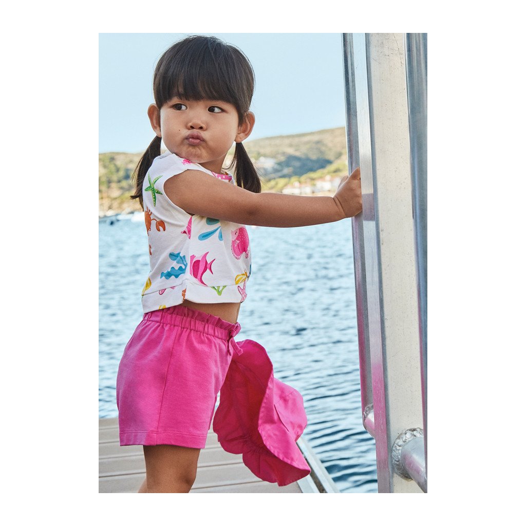 Šortky v tóne fuxia sú ľahké, elastické v páse a navrhnuté tak, aby poskytovali maximálne pohodlie počas letných dní. Set je ideálny na dovolenku, ihrisko, prechádzky či bežné každodenné nosenie, pričom ponúka rôzne kombinácie jedného outfitu.