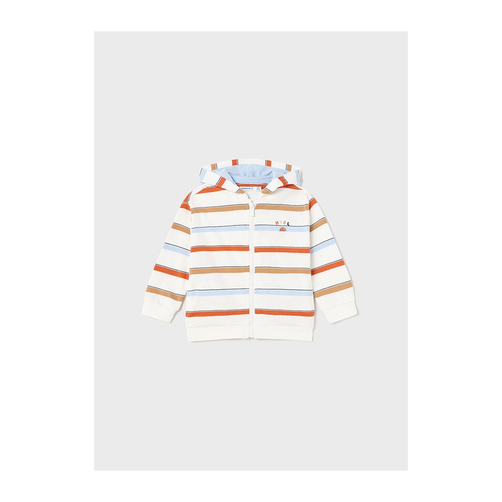 Detská bavlnená mikina Mayoral pre najmenších, biela s farebnými pruhmi, je praktickým a štýlovým kúskom do každodenného šatníka. Mikina je vybavená kapucňou, ktorá poskytuje ochranu pred chladom a vetrom, a predným zipsom, ktorý uľahčuje obliekanie a prispôsobenie teploty.
